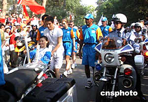 六月九日,火炬手桑蘭在北大未名湖畔借助輪椅完成莊嚴神圣的四百米接力路程。當日,雅典奧運圣火傳遞活動在北京五十五公里的路段進行。中新社記者:張勤