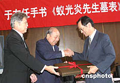 六月十日,泰國(guó)著名愛國(guó)僑領(lǐng)、原泰國(guó)中華總商會(huì)主席蟻光炎先生之子蟻錦中(中)、蟻錦桐(左)在北京將于右任手書《蟻光炎先生墓表》原稿無償捐贈(zèng)給中國(guó)國(guó)家博物館收藏。中新社記者:史利