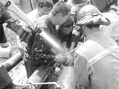 據(jù)朝陽(yáng)市消防局副局長(zhǎng)姚安介紹:“我們共出動(dòng)70余名官兵、10臺(tái)消防車。由于汽油管道發(fā)生炸裂,引起了另一條柴油輸送管道的法蘭盤(管道的接頭)向外泄漏柴油,現(xiàn)在這7條輸油管道每條里都有5噸油,一旦引爆后果不堪設(shè)想。我們用兩臺(tái)泡沫滅火車和若干水槍給管道降溫,同時(shí)用來稀釋泄漏的柴油,并更換法蘭盤!