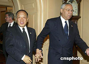 正在華盛頓出席美國前總統(tǒng)里根追悼儀式的中國國家主席胡錦濤特使、外交部長李肇星十一日上午會(huì)見了美國國務(wù)卿鮑威爾。李肇星高度評(píng)價(jià)里根為發(fā)展中美關(guān)系作出的貢獻(xiàn)。雙方重申了在臺(tái)灣問題上的立場。作者:余東暉