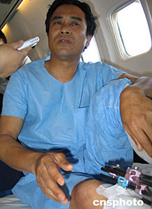 六月十四日十八時許,在阿富汗恐怖襲擊中受傷的五名中國工人,乘專機(jī)抵達(dá)烏魯木齊國際機(jī)場。飛機(jī)停留一小時后直接飛往濟(jì)南,他們將在濟(jì)南的醫(yī)院進(jìn)行救治。圖為受傷最重的席守忠向記者講述事件經(jīng)過。作者:程勇
