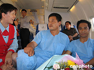 六月十四日十八時許,在阿富汗恐怖襲擊中受傷的五名中國工人,乘專機(jī)抵達(dá)烏魯木齊國際機(jī)場。飛機(jī)停留一小時后直接飛往濟(jì)南,他們將在濟(jì)南的醫(yī)院進(jìn)行救治。圖為傷員與乘務(wù)人員交談。作者:程勇