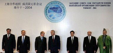 6月17日,上海合作組織塔什干峰會在烏茲別克斯坦首都塔什干召開,六個成員國元首與阿富汗過渡政府總統(tǒng)卡爾扎伊合影。左起:塔吉克斯坦總統(tǒng)拉赫莫諾夫,哈薩克斯坦總統(tǒng)納扎爾巴耶夫,俄羅斯總統(tǒng)普京,烏茲別克斯坦總統(tǒng)卡里莫夫,中國國家主席胡錦濤,吉爾吉斯斯坦總統(tǒng)阿卡耶夫,阿富汗過渡政府總統(tǒng)卡爾扎伊。