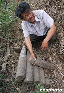 這些炮彈已經(jīng)被挖出二十余年。據(jù)五十八歲的賈衍教老人介紹,大約二十多年前,有一天在翻地的時候,他突然感覺碰到了一個硬東西,仔細(xì)一看竟然是炮彈。起初老人并沒當(dāng)回事,繼續(xù)翻,沒想到越挖越多,總共發(fā)現(xiàn)了十七枚,后來就把炮彈帶回了家。