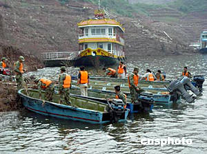 今日凌晨兩時(shí)三十分左右,記者趕到事發(fā)的黃河小浪底北碼頭,只見現(xiàn)場(chǎng)燈火通明,庫區(qū)的水面上搜救船只往來穿梭,一派緊張繁忙的景象。