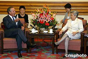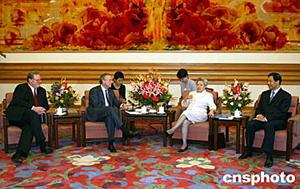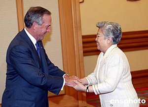 中國國務(wù)院副總理吳儀六月二十三日在北京中南海會(huì)見來訪的美國商務(wù)部長埃文斯。會(huì)談中,吳儀副總理指著自己穿的衣服和鞋子說,這些都是美國產(chǎn)品,也算是為縮小中美貿(mào)易逆差做貢獻(xiàn),幽默的語言引來現(xiàn)場(chǎng)一片歡笑。中新社記者:毛建軍