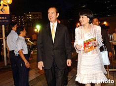 為慶祝香港回歸祖國七周年,中國人民解放軍400人的藝術(shù)團(tuán)6月23日在香港紅磡體育館舉行盛大演出。圖為“賭王”何鴻燊攜姨太梁安琪觀看晚會。作者:洪少葵