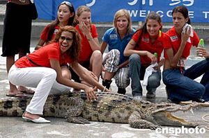 廣州番禺香江野生動物世界六月二十四日迎來參加“二零零四國際超模大賽”國際總決賽佳麗,眾美女在園中與鱷魚親密接觸。她們將參加六月二十六日在廣州舉行的總決賽。作者:中新社
