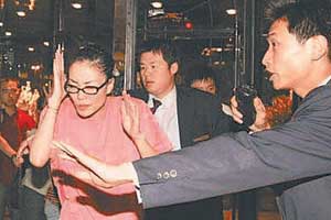 王菲和其助理、孫楠、李亞鵬乘林肯車回酒店,計(jì)劃由孫楠充當(dāng)攝影記者的擋箭牌,分散注意力,保護(hù)二位順利上樓。可是意料之外的是,在酒店門外,十多位王菲的歌迷,苦等了一夜,依舊站在那里不停地呼喊,氣勢不減;還有,記者的兩臺車始終分隔在林肯轎車的前后,原本要躲避影迷從酒店員工通道進(jìn)入的林肯轎車不得不兜了一大圈后,?吭诰频暾T。歌迷瘋狂到了極點(diǎn),孫楠根本無法引開火力,緊要關(guān)頭,一向低調(diào)的王菲親自掩護(hù)起李亞鵬來。