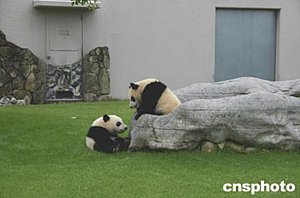 六月下旬,世界第一對由母體同時撫育長大的大熊貓“隆浜”和“秋浜”與母親“梅梅”在日本和歌山白浜野生動物園草坪上玩耍。這對雙胞胎二零零三年九月八日出生在日本,“隆浜”現(xiàn)在體重已達十七點九公斤,“秋浜”達十九點三五公斤,體態(tài)嬌憨,十分惹人喜愛。一般說來,熊貓產(chǎn)下雙胞胎,由于顧此失彼,很難由母體成功地撫育。作者:肖龍聯(lián)