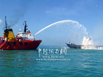 此時,觀摩演習的人們發(fā)現(xiàn),在出事船只周圍,已經(jīng)有多條各類救助船開始行動,中國救助船“南鷹”輪和“南海救一六八”輪一左一右向燃燒著的遇難船只進行壓制性滅火。兩只泡沫槍和一只高壓水槍對準海難船強制滅火。此時的場面蔚為壯觀,一只高壓水槍激起的水霧在熱帶陽光的照耀下出現(xiàn)了一道漂亮的彩虹。