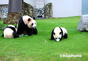 日本和歌山市白浜野生動(dòng)物園是中外合作繁育大熊貓最多的“兵團(tuán)”。十年前,中日雙方簽定協(xié)議,聯(lián)手繁育研究大熊貓,現(xiàn)在該園已由當(dāng)初的兩只大熊貓繁育成有六只大熊貓的大家族了。圖為大熊貓“隆浜”、“秋浜”與母親“梅梅”在日本和歌山白浜野生動(dòng)物園玩耍。作者:肖龍聯(lián)