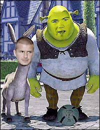 圖1則把貝克漢姆設(shè)計(jì)為了《怪物史萊克》中那只喋喋不休的驢子,而本屆歐錦賽上表現(xiàn)出色的小將魯尼則成為了史萊克。