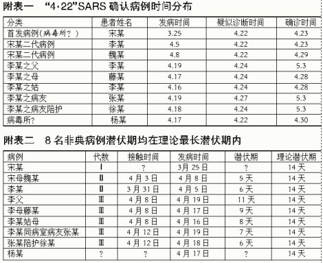 另外,賀雄介紹,以宋某為一代病例,從后續(xù)病例與前代最早接觸時(shí)間為暴露點(diǎn)開(kāi)始計(jì)算,北京“4.22”SARS疫情中傳播鏈清晰的8名病例的潛伏期均在傳染性非典型肺炎理論最長(zhǎng)潛伏期之內(nèi)。但首發(fā)病例宋某的接觸病毒時(shí)間和潛伏期尚無(wú)法推算;病毒病所博士生———患者楊某的接觸時(shí)間、傳播鏈位置和潛伏期亦存在疑問(wèn)。