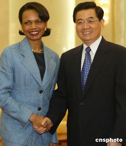 中國(guó)國(guó)家主席胡錦濤,七月九日在北京會(huì)見(jiàn)美國(guó)總統(tǒng)國(guó)家安全事務(wù)助理康多莉扎·賴(lài)斯。中新社記者:鄭萍萍