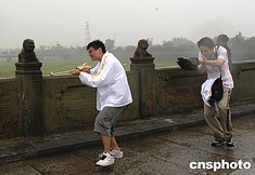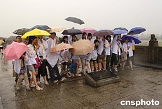 香港中學(xué)生社會(huì)實(shí)踐旅游團(tuán)隊(duì)的學(xué)生們,七月十一日冒雨參觀北京郊外盧溝橋,實(shí)地感受、了解中國(guó)近代歷史的滄桑歷程。中新社記者:鄒憲