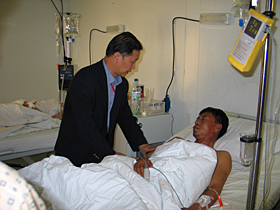 昆都士距喀布爾雖僅有三百多公里,但由于道路遭多年戰(zhàn)爭破壞,陸路要走八個小時。孫大使、徐武官和馬斗馳武官助理一行三人于上午10時登上聯(lián)合國僅有十幾個座位的小飛機(jī),11時10分抵達(dá)。這起重大恐怖襲擊事件震驚了世界,也牽動了黨和國家領(lǐng)導(dǎo)人的心。孫大使臨赴工地前已得到胡錦濤主席、吳邦國委員長和溫家寶總理的指示,要求大使館全力搶救受傷同胞,妥善處理善后事宜。