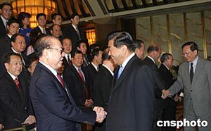 七月十六日,全國(guó)政協(xié)主席賈慶林、國(guó)務(wù)委員唐家璇在北京釣魚臺(tái)親切會(huì)見了出席第三屆世界華人論壇的全體代表。中新社記者:史利