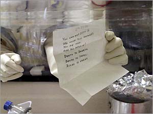 2001年發(fā)生的炭菌襲擊共造成5人死亡、17人受傷。911襲擊一個月后,沾有炭菌粉末的郵件被投寄到政府辦公室、新聞機構(gòu)、紐約郵局和多名參議員,造成多家機構(gòu)關閉,老百姓人心動蕩。目前還沒有一人因炭菌襲擊被起訴。