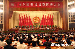 中新社北京七月二十日電 第七次全國歸僑僑眷代表大會二十日在人民大會堂隆重開幕。胡錦濤、吳邦國、溫家寶、賈慶林、曾慶紅、黃菊、吳官正、李長春、羅干等黨和國家領(lǐng)導(dǎo)人到會祝賀。