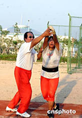 國家田徑隊女子鏈球組優(yōu)秀運動員顧原(右),二○○四年七月中旬在日照山東省體院訓練基地緊張訓練,備戰(zhàn)雅典奧運會。圖為教練歐喜元(左)正在為顧原做技術(shù)指導。中新社記者:張勤