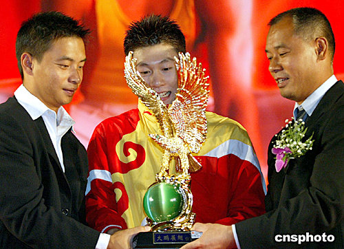 七月二十七日,中國體操宿將李寧(右)、李小雙(左)向即將出征奧運會的體操名將李小鵬送上象征“大鵬展翅”的生日禮物,預祝他奧運捧金。當日是李小鵬二十三歲的生日。中新社記者:鄭萍萍