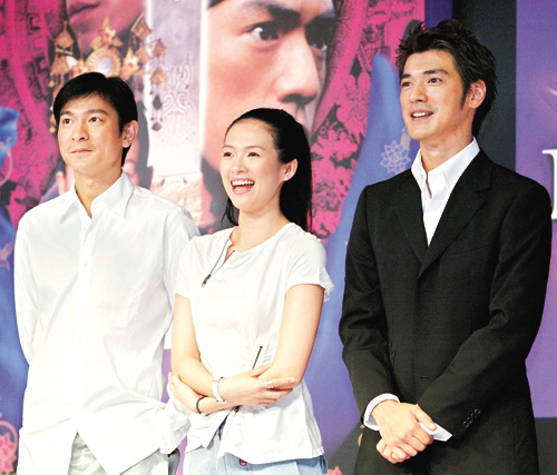 中新網(wǎng)7月28日電 據(jù)香港大公報(bào)報(bào)道,昨日,《十面埋伏》在東京六本木舉行盛大記者會(huì),導(dǎo)演張藝謀率領(lǐng)三位主角劉德華、金城武及章子怡出席,吸引大批傳媒到訪,多達(dá)五百人,非常熱鬧。
