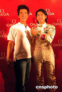 七月二十七日,世界上首位駕駛一級(jí)方程式賽車(chē)的中國(guó)車(chē)手董荷斌與著名歌手任賢齊聯(lián)袂展示歐米茄超霸賽車(chē)系列手表。從當(dāng)天開(kāi)始,董荷斌和世界頂級(jí)賽車(chē)手舒馬赫并列成為歐米茄賽車(chē)名人大使。作者:韓藝冰