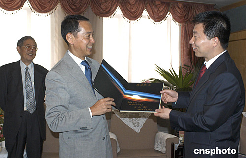 七月三十日,中國首飛航天員楊利偉(右)與日本首飛航天員毛利衛(wèi)(左二),在北京中國科技會(huì)堂會(huì)面。中國科學(xué)技術(shù)協(xié)會(huì)主席周光召(左一)主持了會(huì)見儀式。中新社記者:鄒憲