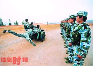 在海軍陸戰(zhàn)隊(duì),幾乎所有的訓(xùn)練課目都是直接挑戰(zhàn)生命極限,沖擊生命禁區(qū)。美國(guó)太平洋艦隊(duì)司令員麥基上將曾稱贊中國(guó)海軍陸戰(zhàn)隊(duì)的訓(xùn)練機(jī)械和標(biāo)準(zhǔn)是世界一流。