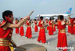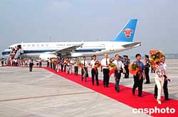 廣州新白云國際機(jī)場遷建落成慶典二○○四年八月二日在新機(jī)場停機(jī)坪舉行。一架空中客車在新機(jī)場降落并停在慶典會(huì)場,一百二十名新機(jī)場的建設(shè)者手棒鮮花走下飛機(jī)走向會(huì)場參加落成慶典。作者:羅仰明