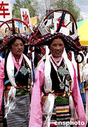 今夏西藏江孜地區(qū)農(nóng)民在盛大民間傳統(tǒng)活動(dòng)中展示當(dāng)?shù)夭刈宸棥V袊?guó)藏區(qū)地域廣泛,藏族服飾十分豐富,然變化最大的在于他們的頭飾。中新社記者:王麗南