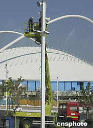 雅典奧運(yùn)會(huì)主體育場(chǎng)外的收尾工程當(dāng)?shù)貢r(shí)間8月13日緊張進(jìn)行,工人們冒著烈日安裝擴(kuò)音設(shè)施。中新社記者:任晨鳴