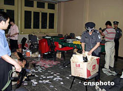 | 近日,北京昌平警方成功破獲一起賭博案,抓獲涉嫌參賭人員14名,當(dāng)場(chǎng)收繳賭博用撲克200副,鑒偽點(diǎn)鈔機(jī)一臺(tái),賭資(人民幣)5571元、籌碼28萬(wàn)余元。該賭博場(chǎng)所設(shè)在一個(gè)三層小樓的一層,室內(nèi)面積約30平米,在房間內(nèi)擺著一張長(zhǎng)條桌,桌上擺放著賭具,而在該房間的門(mén)口正上方懸掛著一個(gè)叫“得意樓”的大牌匾,他們是以“百家樂(lè)”的方式進(jìn)行賭博。目前,此案正在進(jìn)一步審理中。作者:甘洪斌
