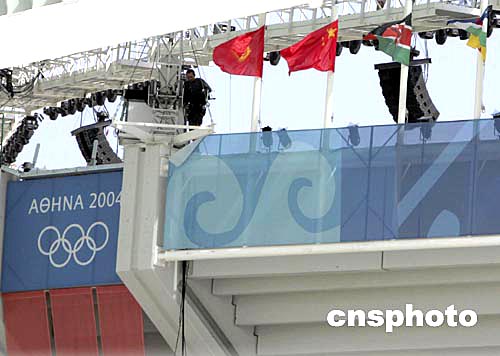當(dāng)?shù)貢r(shí)間8月3日下午,雅典奧運(yùn)會(huì)開(kāi)幕式依然在戒備森嚴(yán)的主體育場(chǎng)秘密演練,一名軍警在體育場(chǎng)最高處居高臨下監(jiān)視四下的一舉一動(dòng)。中新社記者:任晨鳴