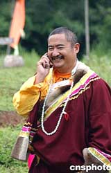 云南麗江古城文筆山文峰寺的喇嘛,使用新款手機與外界聯(lián)系,文峰寺是文物重點保護單位,在當?shù)孛癖娭杏谐绺叩牡匚。作?洪少葵
