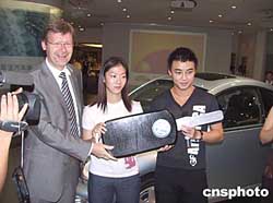 8月4日在北京王府井一次車展上,大眾汽車分別向此次雅典奧運會的中國乒乓球隊主力隊員王皓、牛劍鋒獎勵一輛“甲克蟲”型大眾汽車,預(yù)祝中國乒乓球隊在奧運會上再獲佳績。作者:任振興