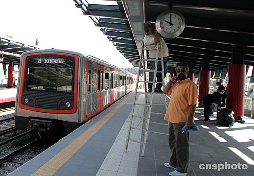 通往雅典奧運(yùn)會(huì)主會(huì)場(chǎng)的輕軌鐵路雖然已經(jīng)通車多日,但是多項(xiàng)收尾工程至今未完成。當(dāng)?shù)貢r(shí)間8月7日清晨,希臘工人依照傳統(tǒng)習(xí)俗不緊不慢地在站臺(tái)調(diào)試一直沒(méi)有運(yùn)行的時(shí)鐘。中新社記者:任晨鳴