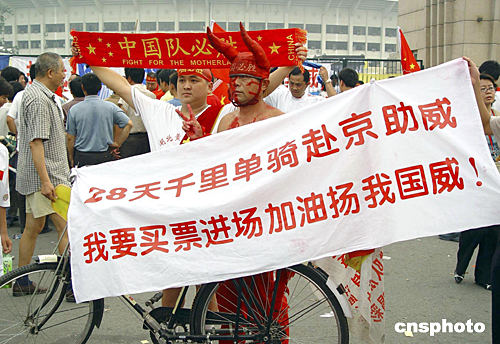 走在沮喪球迷的隊(duì)伍中,心情難免不好。這時(shí)從對(duì)面跌跌撞撞地走來一位年輕的中國球迷,用沙啞的嗓音不停地唱著《歌唱祖國》?吹贸觯苍S是失敗的打擊太大,他已經(jīng)有些神志不清了,身邊的女友眼含淚水,默默地陪在他身邊。許多經(jīng)過的女球迷也已經(jīng)眼眶濕潤。