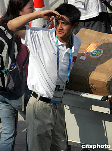 中國(guó)奧運(yùn)代表團(tuán)團(tuán)長(zhǎng)袁偉民率大軍抵達(dá)雅典。中新社記者:任晨鳴