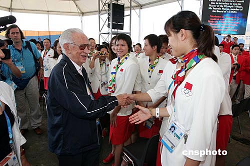 薩馬蘭奇與中國(guó)游泳隊(duì)員握手交談。當(dāng)?shù)貢r(shí)間八月九日上午,參加雅典奧運(yùn)會(huì)的中國(guó)體育代表團(tuán)在雅典奧運(yùn)選手村舉行升旗儀式時(shí),國(guó)際奧委會(huì)主席薩馬蘭奇專程前來(lái)看望代表團(tuán)成員。中新社記者:毛建軍