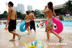 連日來深圳市持續(xù)高溫天氣,但深圳的旅游景區(qū)依然火爆,處處呈現(xiàn)游客火熱的身影。圖為歡樂谷瑪雅海灘成為游客防暑降溫的好去處。作者:陳文