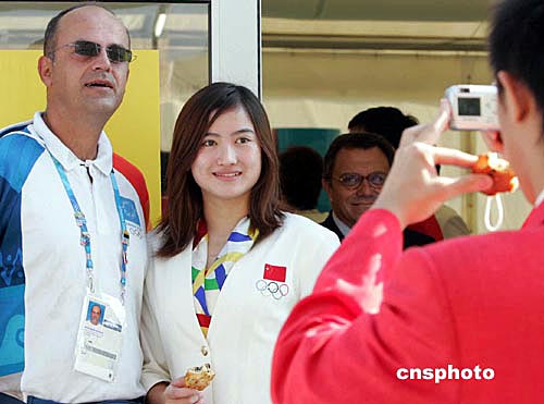 當(dāng)?shù)貢r間八月九日上午,參加雅典奧運會的中國代表團中漂亮的女選手在選手村亮相,當(dāng)?shù)毓ぷ魅藛T爭相與之合影。中新社記者:毛建軍