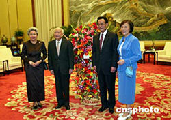 中新社北京八月九日電 (記者 朱大強(qiáng))中國全國人大常委會委員長吳邦國今天在人民大會堂會見了柬埔寨國王諾羅敦·西哈努克和王后諾羅敦·莫尼列·西哈努克。賓主進(jìn)行了親切友好的交談。