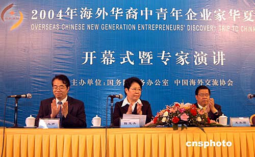 八月十日,由國務(wù)院僑務(wù)辦公室、中國海外交流協(xié)會聯(lián)合主辦的“2004年海外華裔中青年企業(yè)家華夏行”在北京舉行開幕式。國僑辦主任陳玉杰(中)與博鰲亞洲論壇秘書長龍永圖(右)、國僑辦副主任許又聲(左)出席開幕式。來自十七個國家和地區(qū)的五十余位代表未來幾天將在北京參加各種交流活動以拓展商機(jī)。作者:徐曦弋
