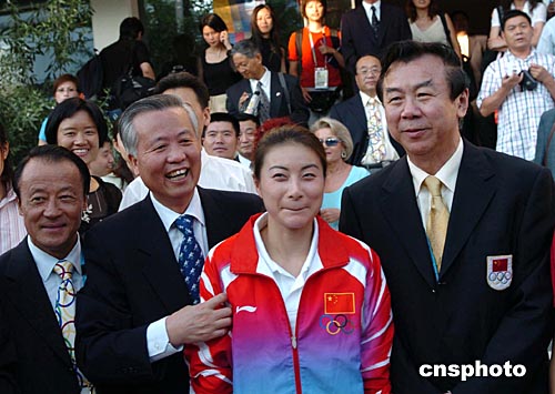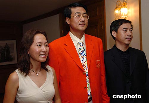 昔日世界冠軍王軍霞現(xiàn)身雅典,在歡迎中國奧運(yùn)代表團(tuán)的酒會(huì)上,仍然是注目的人物。作者:陳佳