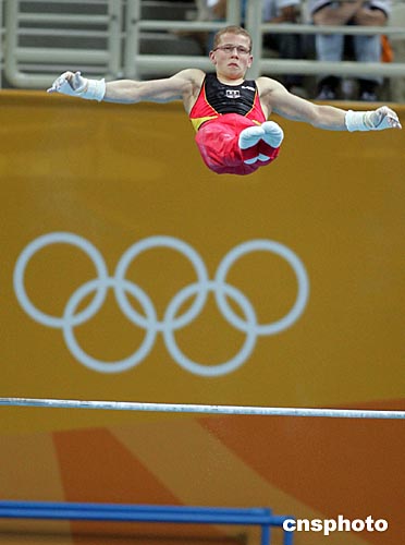 中國男子體操隊當地時間八月十一日晚上在雅典奧運體操比賽館與德國、日本、烏克蘭隊進行集體合練,德國選手進行單杠訓練。中新社記者:毛建軍