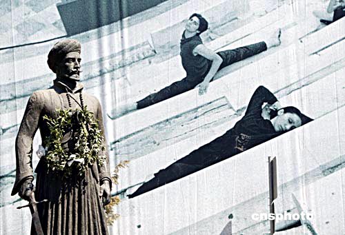 雅典街頭的古代石像與奧運(yùn)廣告牌相互映襯,別據(jù)一格。中新社記者:王瑤