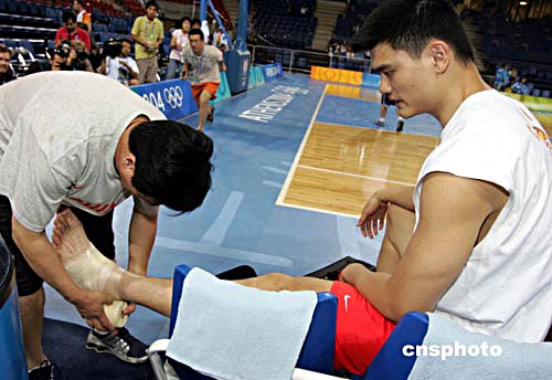 “姚明來(lái)了!”一聲聲欣喜的驚呼后,各路老記從不同的方向奔向已在休息長(zhǎng)椅上坐下的姚明。姚明在隊(duì)醫(yī)的協(xié)助下往腳上裹纏紗布的畫面被無(wú)數(shù)的照相機(jī)和攝影機(jī)攝入鏡頭。