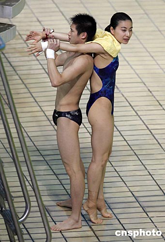 雅典時間八月十二日下午,中國女子跳水名將郭晶晶在隊友的幫助下進(jìn)行奧運(yùn)賽前訓(xùn)練的準(zhǔn)備活動。中新社記者:毛建軍